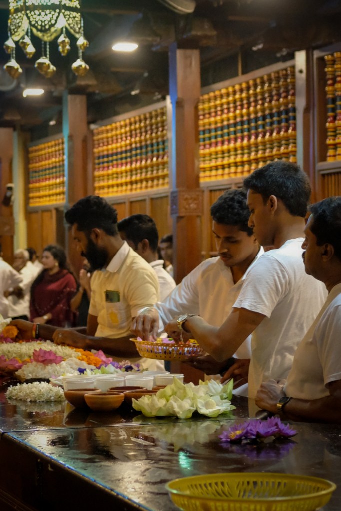 Dusk at the Temple of the Sacred Tooth Relic, or Sri Dalada Maligawa as it is locally known, is a particularly magical hour. Next to the glowing blue of Kandy Lake, the subtle colors of the temple grounds are illuminated by throngs of Buddhists clad in pristine white. Filing barefoot into the temple, they bring offerings of cut purple lotuses and water lilies and arrange them lovingly over the altars, so that the entire table eventually appears to be made of flora. Outside, as caretakers sweep the floor, they stir up the scent of jasmine.