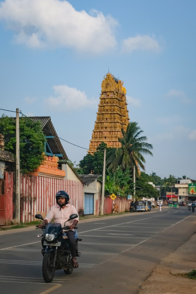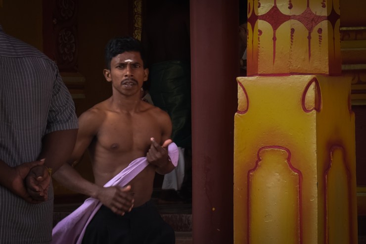 The bats emerge long before the light starts to wane. Larger than gulls, they glide through the sky with wingspans as dark and wide as the coming night. Every evening at six, the sound of the nadaswaram reed, as grave and flat as a hooded cobra, pierces the air around Nallur Kandaswamy Kovil, drawing devotees through its golden nine-tiered gopuram for worship, or puja. Before entering, shoes must be removed, and men must also take off their shirts.