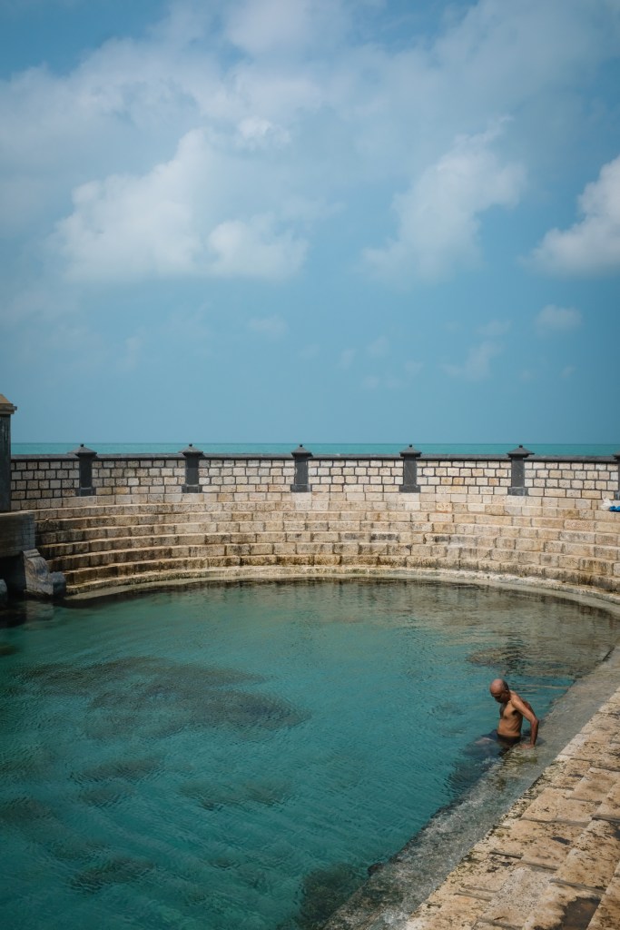 From Jaffna’s bus station, it takes 150 Sri Lankan rupees (US $0.50) and less than an hour to cross the Jaffna Peninsula. The ride is breezy and orderly, traversing fields of swaying palmyra palms and whiffs of mango and gasoline before reaching the quaint seaside village of Keerimalai. Here on the northern rim of Sri Lanka lies the Keerimalai Naguleswaram Kovil, one of the oldest shrines in the region. Just adjacent is an ancient natural mineral spring. Already reputed for its healing properties since at least the seventh century, the Keerimalai Spring is separated from the ocean by a mere stone wall. The water in the encased open-air pool is slightly brackish, a mélange of salt and warm freshwater that pumps into the well from a secret source. After a morning puja in the kovil, many come to enjoy a cooling dip. Under a tropic sun, the aquamarine spring glistens seductively with effervescent constellations of light. As remote as it is, Keerimalai comes perhaps the closest to encapsulating the magic and serendipity of Sri Lanka.