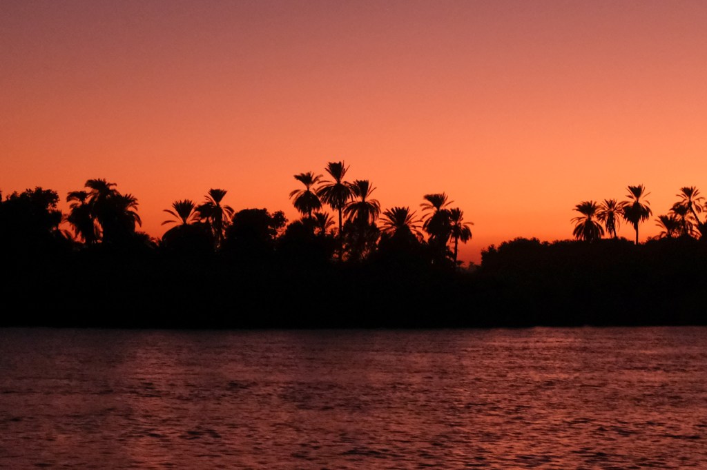 Departing Aswan, ships first stop at Kom Ombo—a place I will remember as having the most persistent souvenir vendors. The temple walls here are known for their cartouches of Cleopatra as well as for depictions of human sacrifices. Between Kom Ombo and Edfu unfolds some of Egypt’s most stunning scenery: groves of branching doum palms, double-masted dahabiyas drifting lazily downstream, fiery sunsets that set the river ablaze, and men in flowing jellabiya—Egypt’s traditional loose-fitting garment—moving unhurriedly alongside it all.