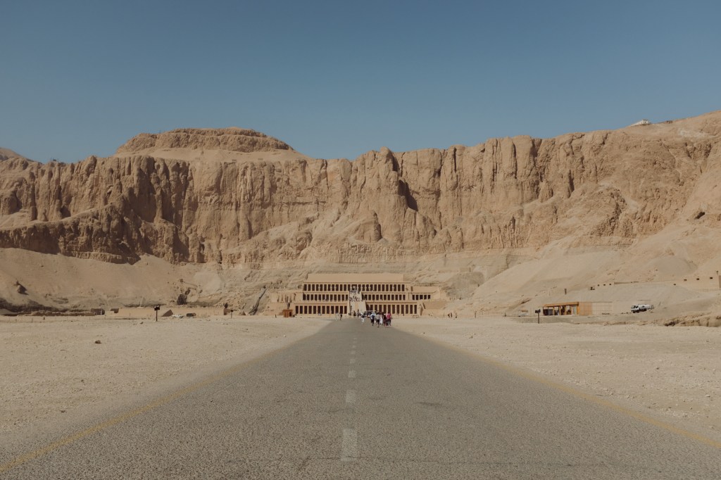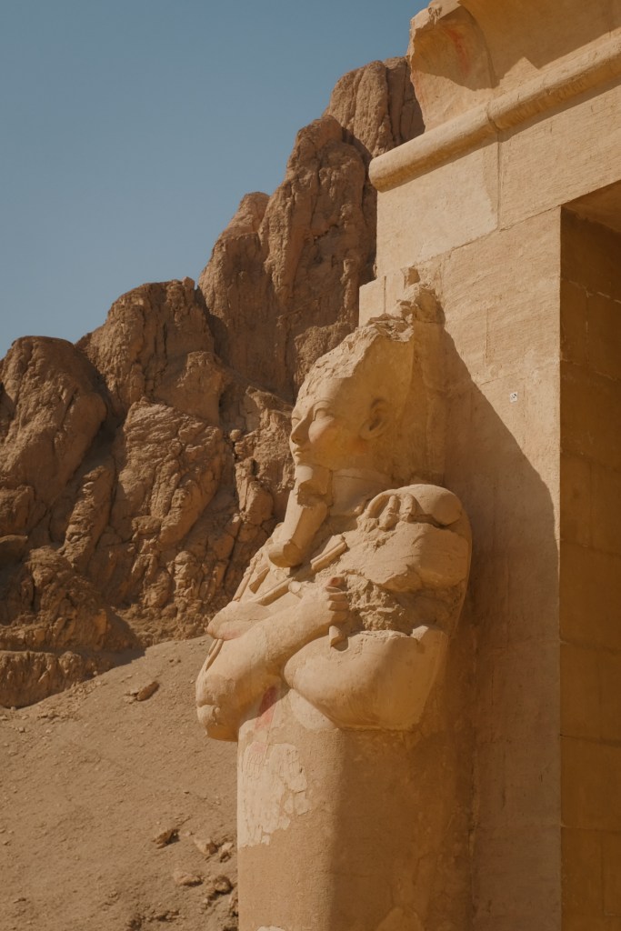 The Valley of the Kings presents an image of Ancient Egypt distinct from the one shaped by the Pyramids. While earlier pharaohs built grand tombs above ground, New Kingdom rulers favored to conceal their resting places. Modest tomb entrances hide long corridors that still preserve many hieroglyphs in their original vivid coloring. One architectural highlight in the Valley is the Temple of Hatshepsut, known for its symmetrical terraces set against jagged cliffs. The depiction of Hatshepsut—a female ruler shown in traditional male regalia—adds a further layer of intrigue.